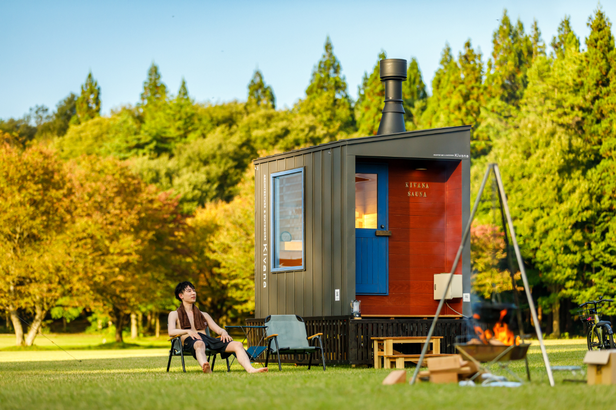芝生の上でテントやチェアを広げて、移動式&テントサウナで“ととのい体験”。