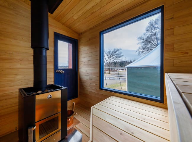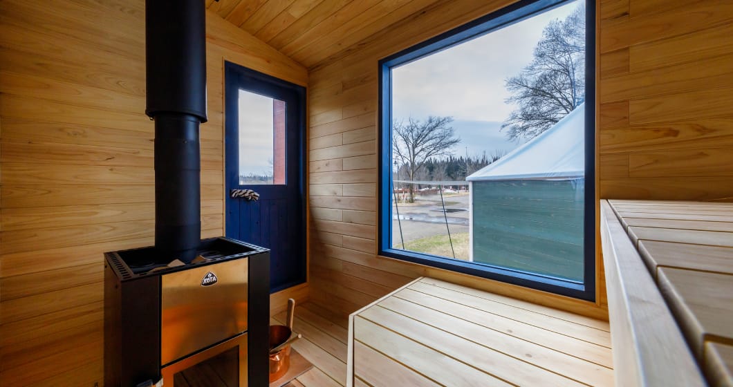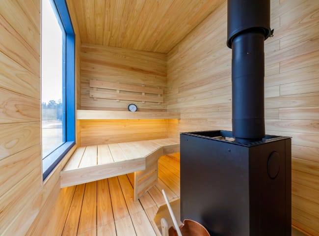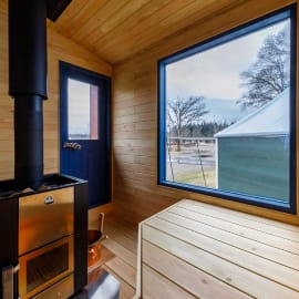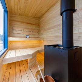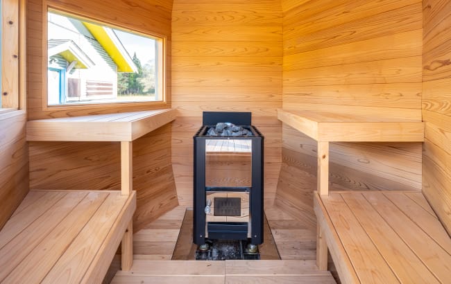 都会でも、大自然の中でも。洗練されたデザインで、どんな風景にも溶け込む“誰もが欲するサウナ小屋”。外壁は耐久性と美しさを両立するガルバリウム鋼板仕上げ。一部に天然木の板張りをあしらい、素材のコントラストが際立ちます。大きな窓から差し込む光と、室内のヒノキ板張り+LEDライティングが、心地よい香りと温もりを演出。ヒーターは電気式・薪ストーブ式のどちらも選択可能。断熱・気密性能は北国の環境で鍛え抜かれ、四季を通して快適なサウナ体験を楽しめます。