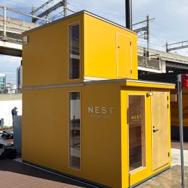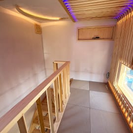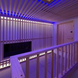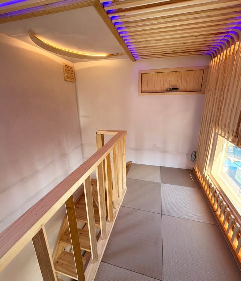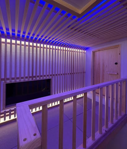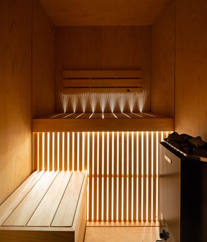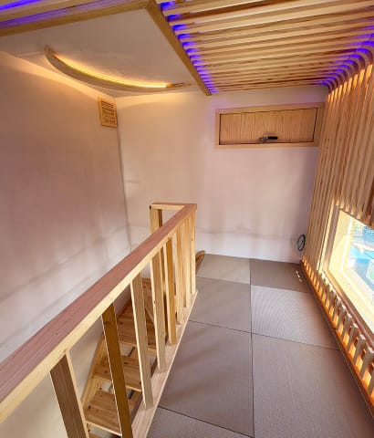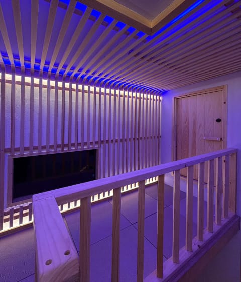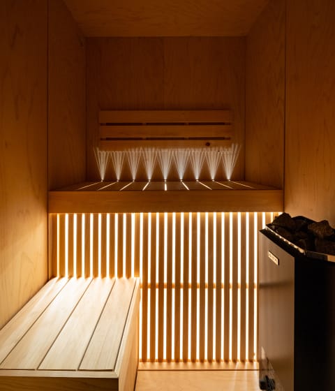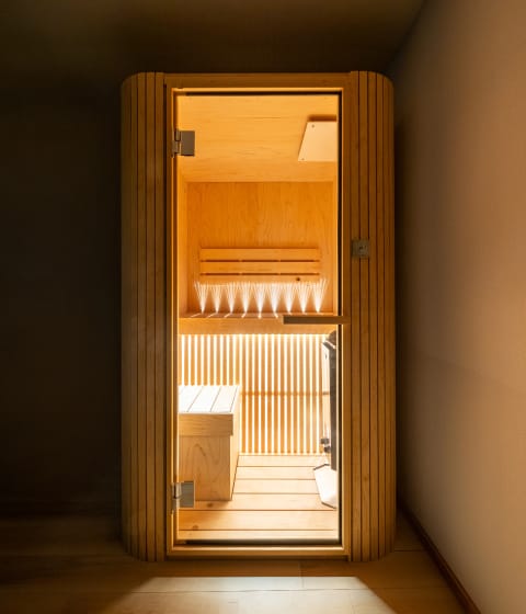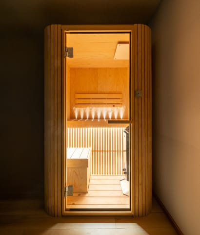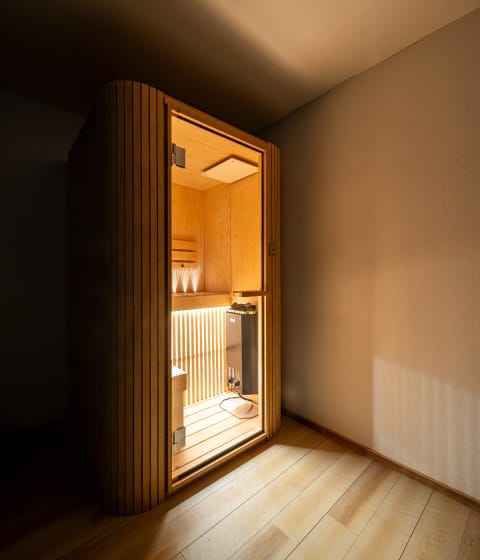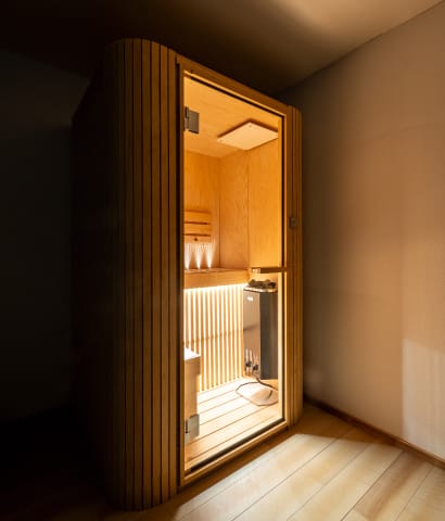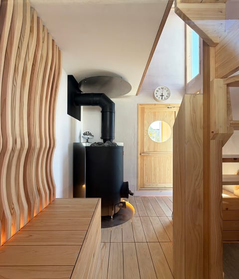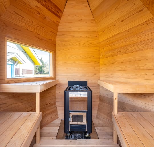 家族や友人と温度差を楽しめるサウナ。オプションのロフトを付けることで上下階で異なる熱環境を体験できる、遊び心とデザイン性を兼ね備えたサウナです。外壁は吹付塗装仕上げで、縦型のガラスが印象的。屋根にはガルバリウム鋼板を採用し、屋外でも高い耐久性とシャープなフォルムを実現しています。内装は不燃下地に漆喰仕上げ。ベンチと背板にはヒノキを使用し、LEDライトが温もりある光で空間を包み込みます。上下の温度差を楽しみながら、“家族みんなでワクワクできる”サウナ体験を提供します。