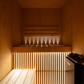 ヒノキの香りに包まれる、やすらぎの屋内サウナ。KOTONEは省スペース設計で、住宅や施設の室内に設置できるコンパクトなインドアモデルです。ヒノキパネル構造により、屋内用でありながら断熱性能もしっかり。ベンチや腰掛けにもヒノキを使用し、入るたびに心地よい香りが空間を包み込みます。電気ヒーター仕様で、静かに“ととのう時間”を楽しめるサウナです。戸建て住宅はもちろん、マンション、スポーツ施設、医療・福祉施設など、さまざまなシーンに設置可能です。